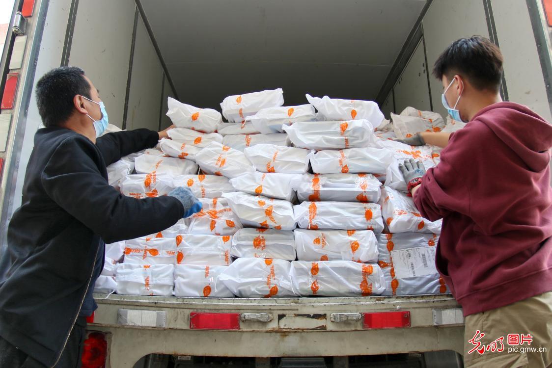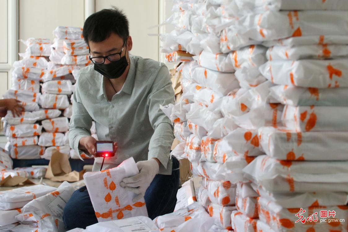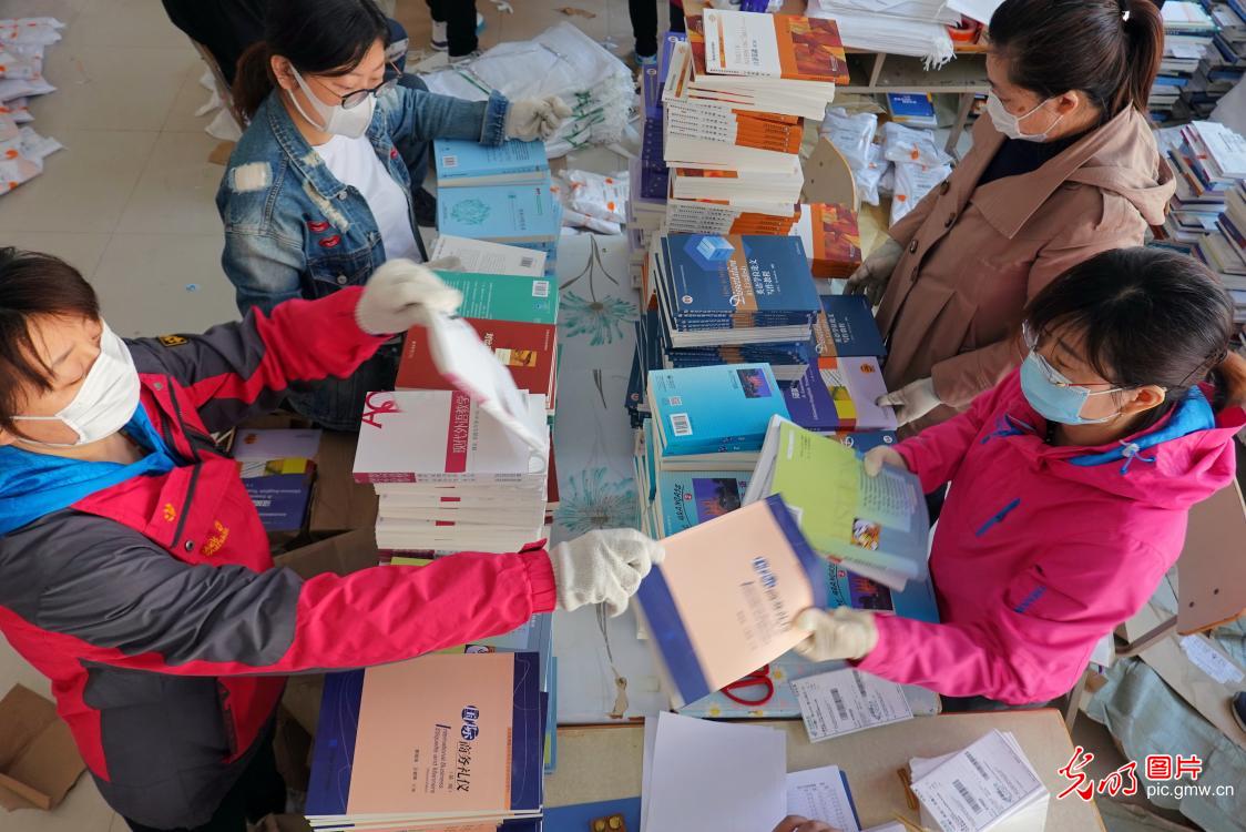 2020年4月30日,工作人員將每個學生需要的教材組配成套。山東煙臺大學與教材供應商和郵政部門密切配合,加班加點向1.9萬名學生寄送本學期紙質版教材,方便學生在線學習和保障線上教學質量。
