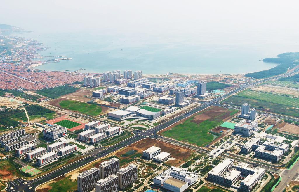 煙臺大學八角灣校區(開發區科教園區)位于煙臺黃渤海新區八角灣濱海地帶,總占地面積1200畝,其中一期用地規劃占地面積610畝,建筑面積約42萬平方米。園區按照“山海方舟”的理念,形成“一軸、雙核、多組團”的結構布局。其中,“一軸”——自西向東、由山向海的校園主軸線,以主體教學設施與禮儀空間構成。“雙核”——東西主軸上最關鍵的兩大設施,一是西區的學術與知識核心——圖書館,東區的行政服務核心——辦公樓。“多組”——分列于東西主軸兩側的生活、文化、體育、創新、交流等多個功能組團。